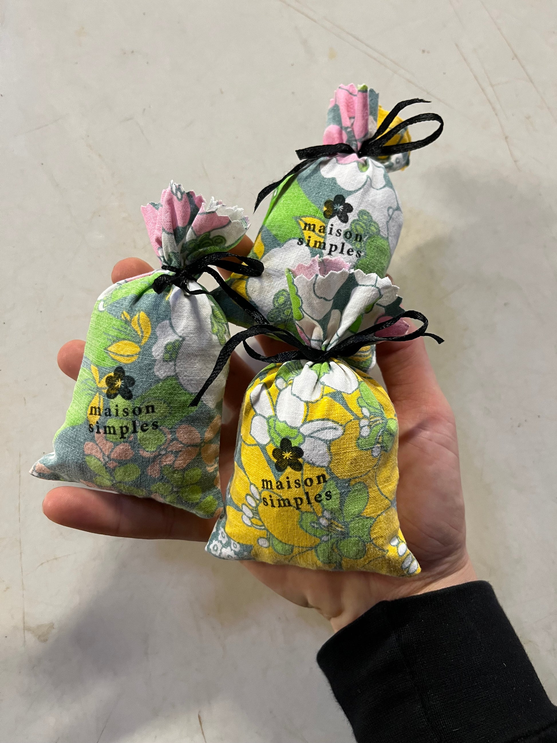 Petit ballotin en tissu tamponné de notre logo, garni de plantes séchées et fermé par un ruban.